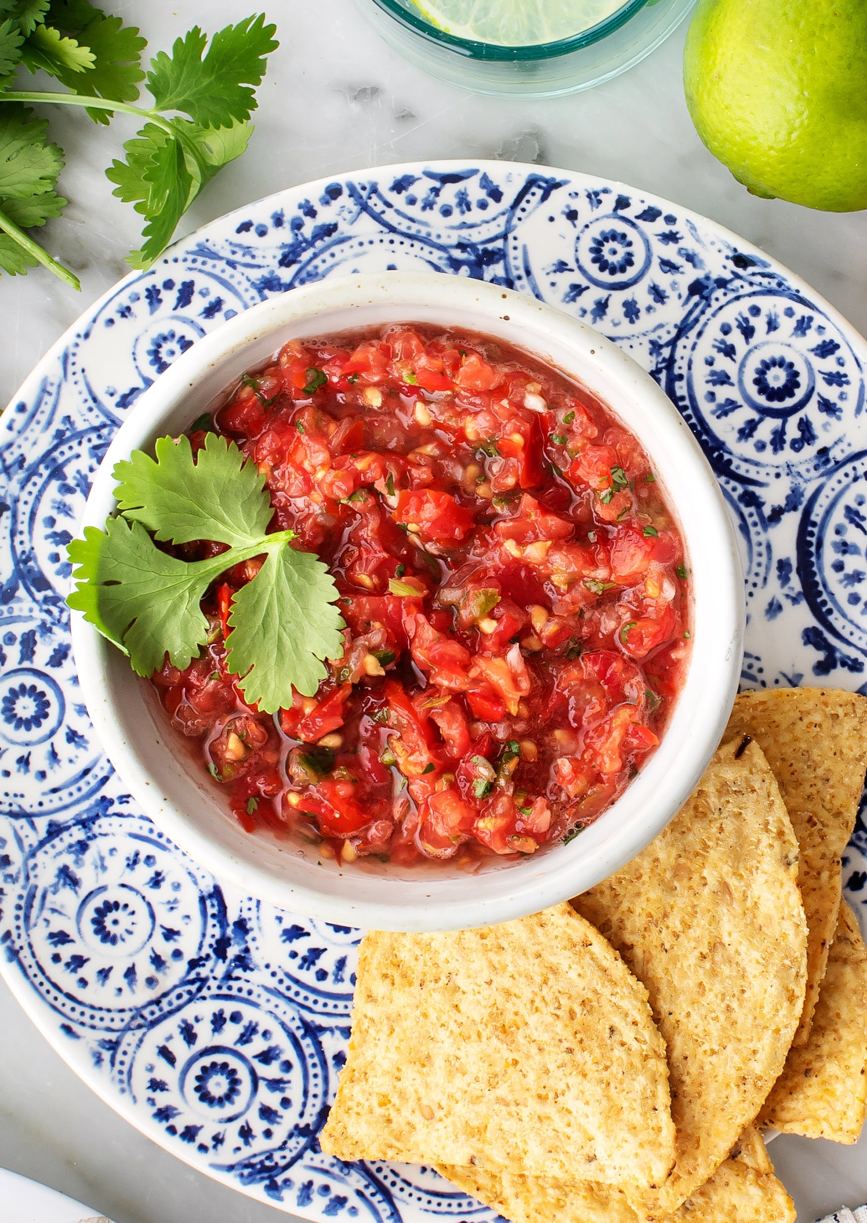 This month, we’re making homemade salsa! I love making this fresh tomato salsa in August. It uses two peak-season veggies—tomatoes and jalapeños—and has a wonderful fresh, bright flavor. It also requires zero cooking and comes together in just 10 minutes using a food processor!