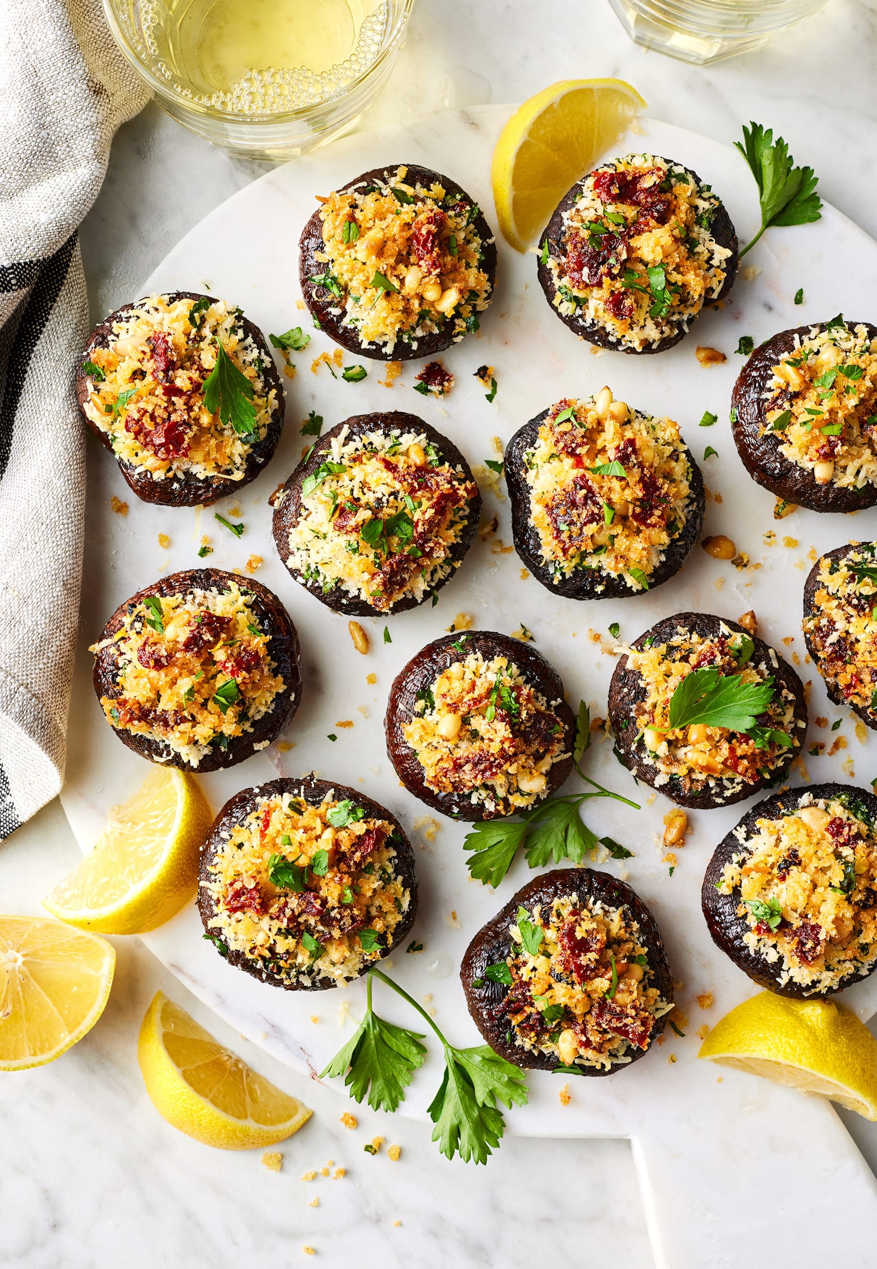 This stuffed mushrooms recipe is one of my favorite party appetizers, especially for the holidays. Instead of making a typical cream cheese filling, I stuff the tender mushroom caps with a crispy, garlicky breadcrumb mixture. Sun-dried tomatoes and Parmesan cheese make it rich and savory, pine nuts add crunch, and parsley adds freshness. Grab two while you’re at the snack table—these bite-sized apps disappear fast.
